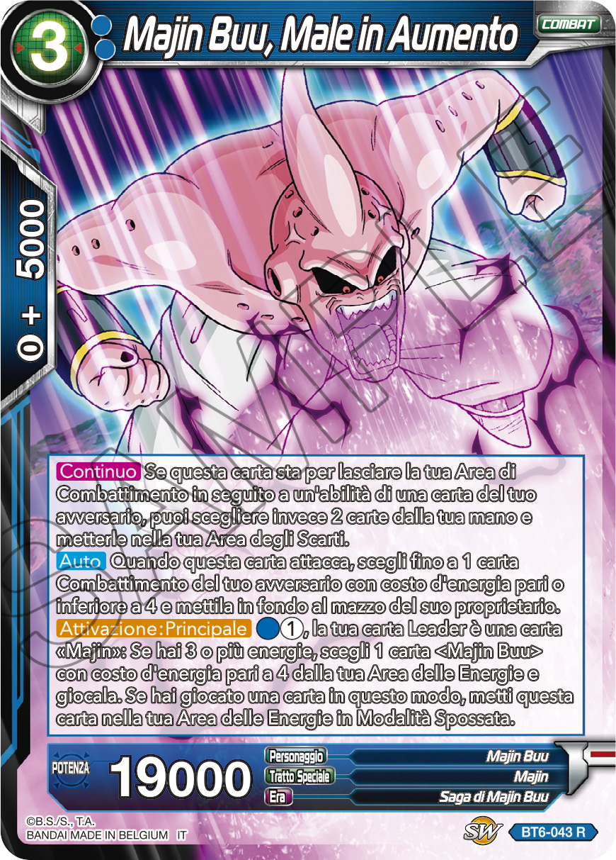 Attivazione: Principale 1, la tua carta Leader è una carta 《Majin》: Se hai 3 o più energie, scegli 1 carta 〈Majin Buu〉 con costo d'energia pari a 4 dalla tua Area delle Energie e giocala. Se hai giocato una carta in questo modo, metti questa carta nella tua Area delle Energie in Modalità Spossata.
